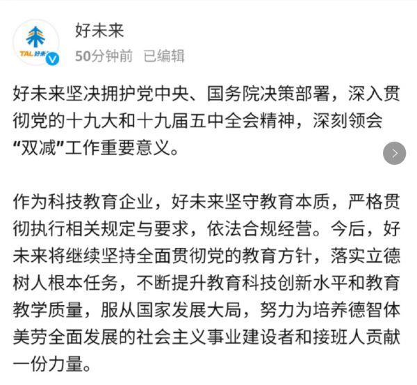 好未来、高途等教培领域头部企业,纷纷通过微博等渠道称,将“坚守教育本质,严格贯彻执行相关规定和要求,依法合规经营”“坚决拥护双减工作,致力于与家庭、学校和政府形成合力”云云。
