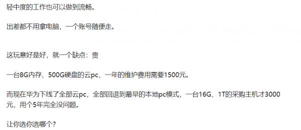 为云电脑4核CPU+8G内存版本的标准型需要59.8元每月,存储空间不够时需要额外购买数据盘,想想这么一年下来也是一笔不小的费用。有华为云电脑用户直言:“轻中度工作可以做到流畅,出差都不用带电脑,一个账号随便走,缺点就是贵,一台8G内存、500G硬盘的云PC,一年的维护费用需要1500元”。刨除网络连接和购买键鼠外设的成本,这笔费用仍是许多用户选择云电脑的一大门槛。
