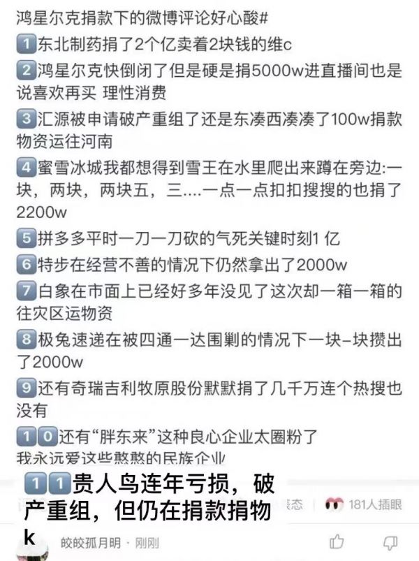 出现在这个神奇组合里的成员,都是这次为河南灾区提供巨大支持的品牌:卖着4元柠檬水的蜜雪冰城前不久还靠着一首洗脑神曲出圈,现在又凭借捐款2200万元,和胖东来、特步等一并被称作“憨憨的民族企业”;经历了破产重组的汇源与贵人鸟也在捐钱捐物,被网友叫停“你自己都破产了,就先别捐了”。