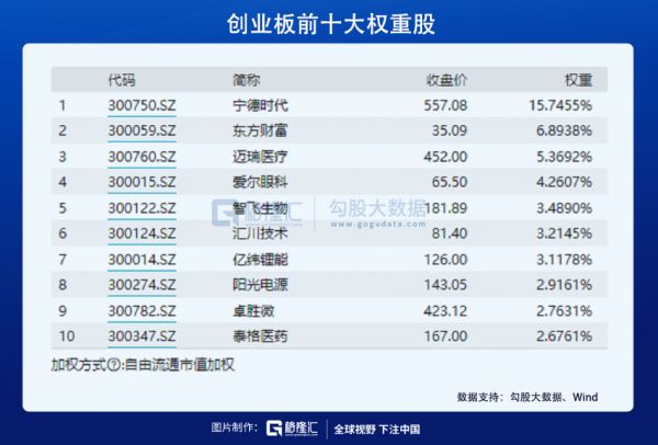 而创业板指数的100家成分股,归属互联网 传媒的公司只有4家,属于制造业的一共72家,前10大权重中,有7家属于高科技术制造业。