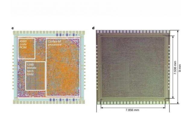 虽然PlasticARM不是首款柔性芯片,但却是最复杂的,由56340个组建构成,包括32位Cortex-M0 CPU (Arm Cortex-M系列中最便宜、最简单的处理器核心),以及456字节ROM和128字节RAM。它有超过18000个逻辑门,Arm称其数量至少是之前塑料芯片的12倍。