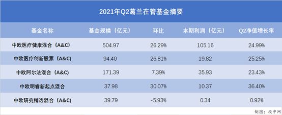 根据季报显示,葛兰持有的5只基金在第二季度皆实现了盈利,本期利润累计达到171.62亿元,其中中欧医疗健康混合一只基金的利润就高达105.16亿元。此外,除今年3月24日刚刚成立的中欧研究精选混合外,其余4只基金第二季度的净值增长率均超过20%。