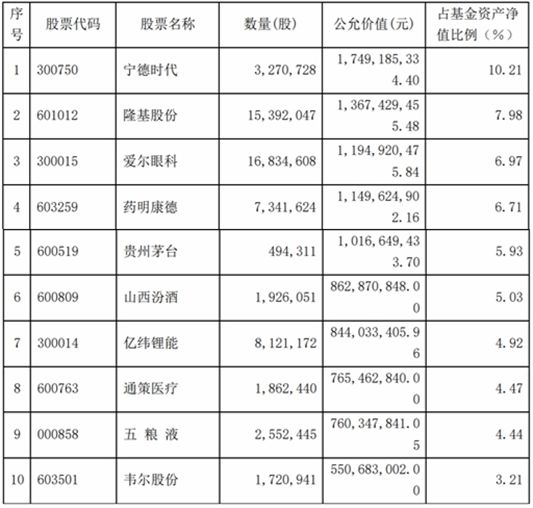 在中欧阿尔法混合的前十大重仓股中,涉及了医疗(爱尔眼科、药明康德、通策医疗)、白酒(贵州茅台、山西汾酒、五粮液)、锂电池(宁德时代、亿纬锂能),以及光伏(隆基股份)和芯片(韦尔股份)多个概念。其中,亿纬锂能和通策医疗为新晋重仓股,占比分别达到4.92%、4.47%。