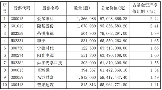 由于没有一季报做对比,这里就主要介绍一下该基金的二季度持仓情况。在中欧研究精选混合的前十大重仓股中,除了葛兰在二季度“偏爱”的爱尔眼科、隆基股份、宁德时代以及药明康德外,还出现了几个新面孔,包括阳光电源(光伏)、舜宇光学科技(光学零件研发)、富瀚微(芯片)、东方财富(互联网券商)以及芒果超媒(网络视频)。