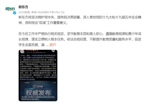 7月24日晚,新东方、好未来等回应“双减”:将坚决拥护党中央、国务院决策部署,深入贯彻党的十九大和十九届五中全会精神,深刻领会“双减”工作重要意义。
