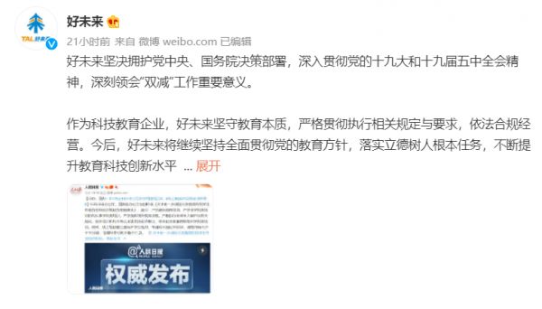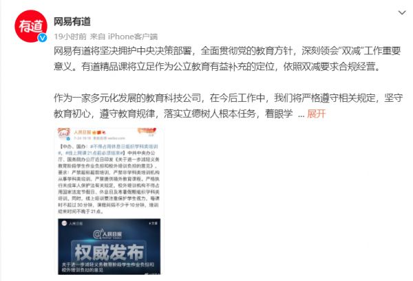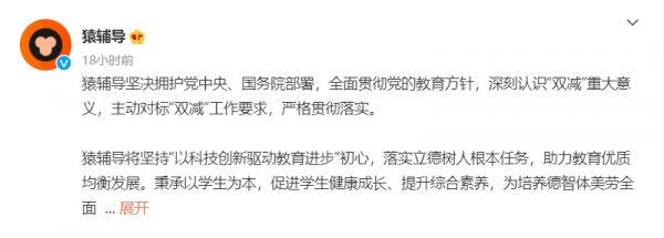 7月25日凌晨,网易有道和猿辅导的官方微博也相继表态。网易有道将深刻领会“双减”工作重要意义,有道精品课将立足作为公立教育有益补充的定位,依照双减要求合规经营,加大科技创新,不断提供高质量的教育产品。猿辅导称,深刻认识“双减”重大意义,主动对标“双减”工作要求,严格贯彻落实。