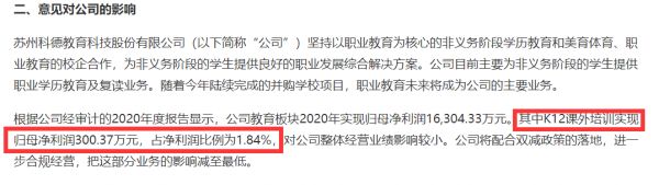 公告称,根据公司经审计的2020年度报告显示,公司教育板块2020年实现归母净利润16,304.33万元。其中K12课外培训实现归母净利润300.37万元,占净利润比例为1.84%,对公司整体经营业绩影响较小。