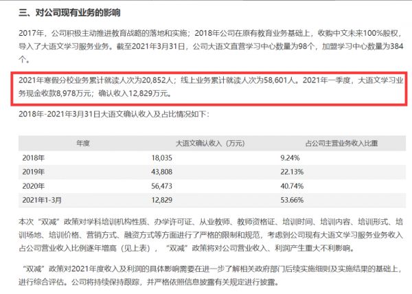 公告称,本次“双减”政策对学科培训机构性质、办学许可证、从业教师、教师资格证、培训时间、培训内容、培训形式、培训场地、培训价格、营销方式、融资方式等方面进行了严格的限制和规范,考虑到公司现有大语文学习服务业务收入占公司营业收入比例逐年增高,(于2021年1至3月,相关业务占公司主营业务收入比重为53.66%),仅2021年一季度,大语文学习业务现金收款8978万元;确认收入1.28亿元。