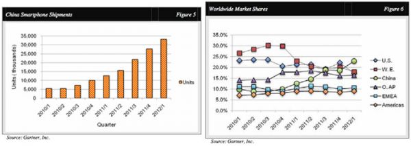 另一部分原因是移动通讯技术的发展普及和国内智能手机市场的日渐壮大,2012年投资公司Needham & Company发布智能手机行业季度报告。报告显示当年第二季度,中国智能手机的出货量同比增长了164%,总数达3310万台,超越同期美国售出的2500万台,成为全球最大的智能手机市场。