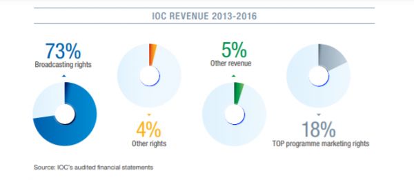 国际奥委会的营收主要来源于出售转播权、全球合作伙伴计划和国际奥委会官方供应商和许可计划。而体育赛事转播权是支持国际奥委会的支柱。