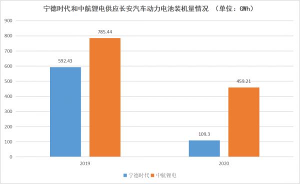 与广汽乘用车相同的是,长安汽车在选择宁德时代作为电池供应商的同时,还选择了中航锂电。只不过不同的是,2019年的装机量方面,中航锂电就已超越宁德时代,两者当年装机量分别为785.44GWh和592.43GWh。