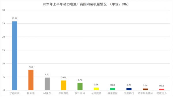 据中国汽车动力电池产业创新联盟统计数据显示,2021年上半年动力电池企业国内装机量排名中,宁德时代以25.76GWh排名第一,比亚迪和LG化学分别以7.65GWh和4.72GWh分列二三位。