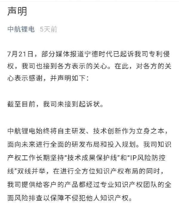中航锂电就“宁德时代专利诉讼”部分声明, 截图自中航锂电官方公众号