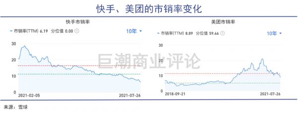 观察两家公司的市销率就能发现,快手在26日正式跌破了发行价,市销率已经同步下降到6.19倍。美团的股价从最高460元开始一路下跌,距离腰斩一步之遥,市销率降至8.89倍。