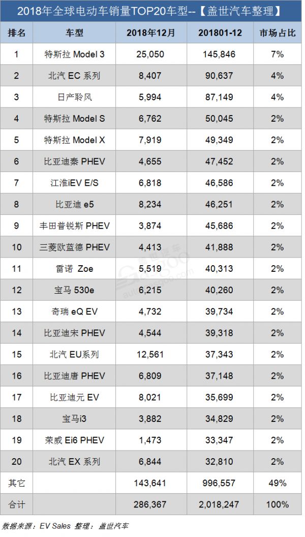 车型销量TOP20: 特斯拉Model 3超越北汽首夺年度销冠