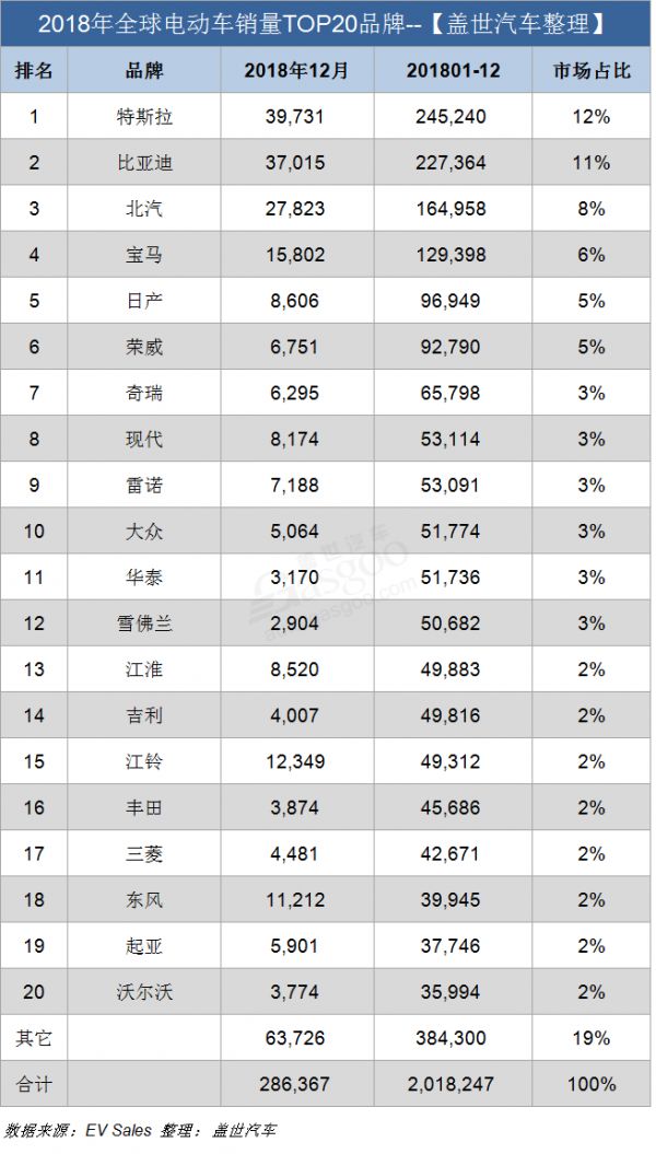 根据EV Sales网站公布的全球电动车销量数据,12月份,全球电动车注册量同比暴涨70%至286367辆,连续四个月实现销量创纪录。得益于12月份的强劲销量,2018年全球电动市场以2018247 辆的成绩实现了200万辆的年度目标,全球PEV份额也创纪录的达到2.1%,较2017年相比劲增72%。