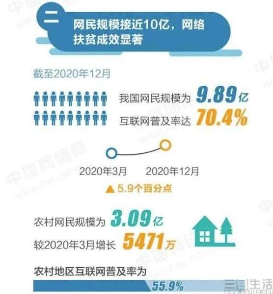 根据此前CNNIC公布的第47次中国互联网统计报告显示,截至2020年12月我国网民规模已达9.89亿,较2020年3月新增网民8540万,互联网普及率达70.4%,较2020年3月提升5.9个百分点,其中农村网民规模为3.09亿,互联网普及率55.9%。在这一数据中不难发现,相互联网普及的整体水平,下沉市场依旧有着不小的发展空间巨大。
