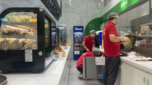 门店人员配置远超便利店,一共6名店员,3名后厨按照客户需求制作商品;2名店员按照客户需求将商品制作、打包和分装;1名店外导购,在自提区引导用户下单、提供购买建议、与客户交接商品等。同时,该店还有一名督导。