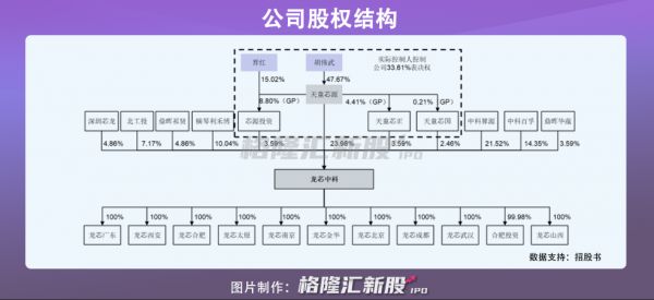 招股书显示,龙芯中科的控股股东天童芯源持有23.98%的股权,公司董事长胡伟武持有天童芯源47.67%的股权,为第一大股东,胡伟武的妻子晋红持有15.02%的合伙份额,二人为龙芯中科实际控制人。中科算源、中科百孚、横琴利禾博分别持有公司21.52%、14.35%和10.04%。