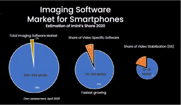 根据Imint数据,智能手机影像软件全球市场总量达2-2.5亿美元,Imint市场份额约2%;视频软件市场总量约7000万-1亿美元,其中Imint占比约7%;视频防抖软件市场总量为1200-1800万美元,其中Imint占比约20%,据Imint数据显示,这是独立软件供应商占到的最大份额。