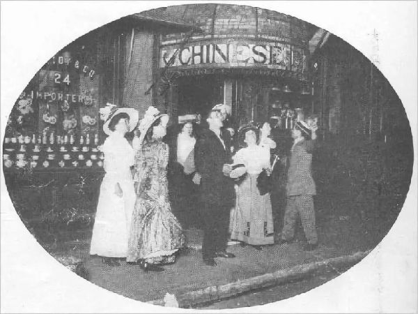 一张出自1909年9月美国Munsey's Magazine杂志的照片,旁边配有说明:“一伙典型的贫民窟游荡者(slummer),他们刚刚吃完杂碎和炒面的午夜大餐,走出了中国餐馆。”