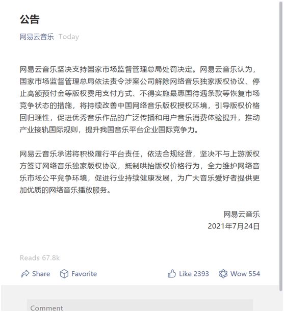 市场监管总局文件一出,网易云音乐迅速发布公告,“坚决支持国家市场监督管理总局处罚决定”“承诺将积极履行平台责任”“抵制哄抬版权价格行为”“促进行业持续健康发展”,台面上绷起一副严肃面孔,其实心里早就乐开了花。