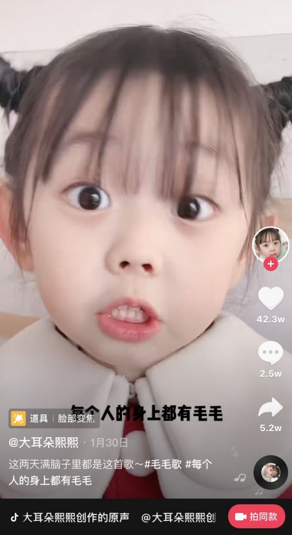 “每个人的身上都有毛毛”也是抖音上比较热门的BMG,这句歌词来源于人称张帝的《毛毛歌》,因在海外商演时遭到一名观众的挑衅,张帝即兴创作了《毛毛歌》,也坐稳了“急智歌王”的称号。这首歌在抖音上重新火爆,是因为一个用户名叫大耳朵熙熙的小朋友对该视频进行了翻唱。