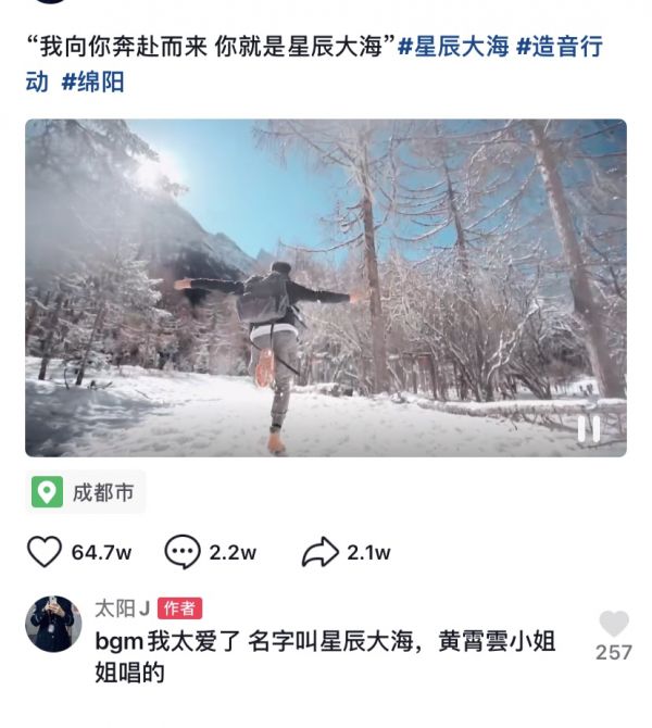另一类音乐梗是没有具体指向性的,这类音乐梗具有丰富的解释和二次创作的空间。以《星辰大海》为例,该音乐梗的表达并没有具体的指向性,所以用户在创作时可以填充各种类型的视频内容,比如运动、旅行、翻唱、萌宠等等,都不会让人觉得奇怪。