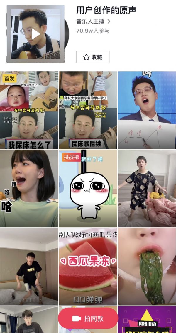 这样简单方便的创作方式就好像是用户创作的助力器。以尿床歌为例,在抖音搜索关键词“我尿床怎么啦”,搜索结果除了原版之外还有原版后续、儿童版、狗狗版、日语版、儿童版舞蹈、原版舞蹈、舞蹈教程等UGC二次创作的版本。