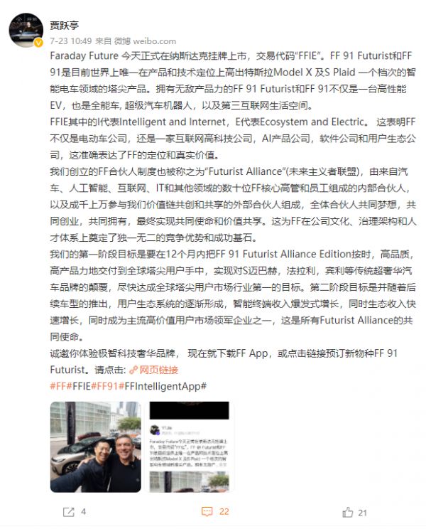 7月22晚,贾跃亭创立的法拉第未来(FF)正式在美国纳斯达克挂牌上市。7月23日,贾跃亭罕见在微博高调宣传FF 91,并表示:“FF 91是目前世界上唯一在产品和技术定位上高出特斯拉Model X及S Plaid一个档次的智能电车,拥有无敌产品力。FF 91不仅是一台高性能EV,也是全能车、超级汽车机器人,以及第三互联网生活空间。”