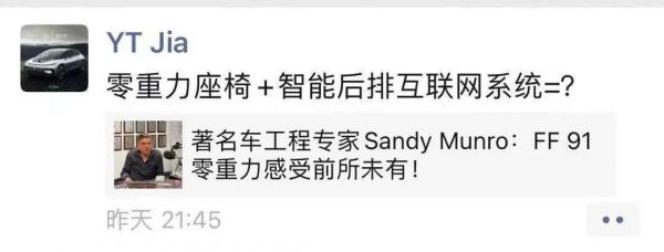 7月25日,贾跃亭在其微信朋友圈分享了一条名为《著名车工程专家Sandy Munro:FF 91零重力感受前所未有!》的视频链接,并配文:零重力座椅+智能后排互联网系统=?由此可见,在贾跃亭看来,二者可谓是FF 91的核心黑科技。那么,这两项技术究竟有多强?