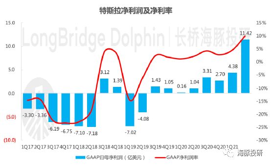 净利润同比增10倍,环比增超3倍,大超预期,同时盈利质量提升。2021年二季度实现GAAP归母净利润11.42亿美元,首次站上10亿美元,同比增近10倍,环比增160%,对应EPS为1.02美元/股,在交付量提升、成本效率提升等因素的综合影响下,远超彭博一致预期(彭博一致预期GAAP净利润为6.2亿美元) 。