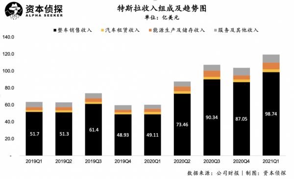 2021二季度,特斯拉实现总营收为119.58亿美元,同比大增98%;