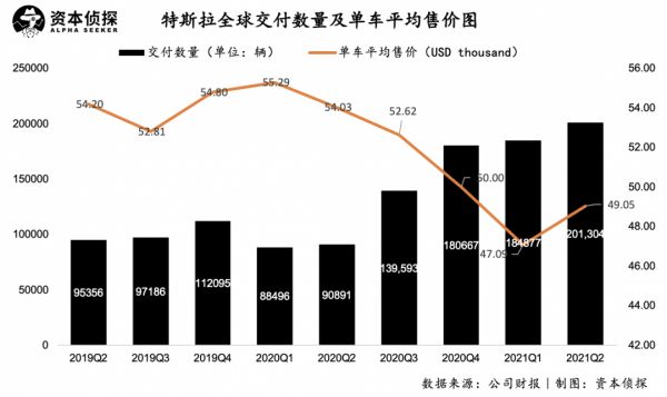 2021年Q2,在交付量再创新高的情况下,特斯拉单车平均售价仍控制在了5万美元以下,由于供应链压力下单车价格上调、Model Y销量占比增大等原因,这一数据较Q1略有增长。