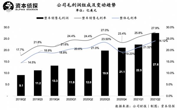 得益于交付量走高,2021年Q2,特斯拉整车销售收入达到98.74亿美元,推动特斯拉总收入同比大增98%达到119.57亿美元;整车销售毛利润达到27.6亿美元,整车销售毛利率再次刷高达到27.9%。特斯拉在造车环节的成本控制能力与定价策略越发精进,销量扩张的同时毛利表现越来越好。