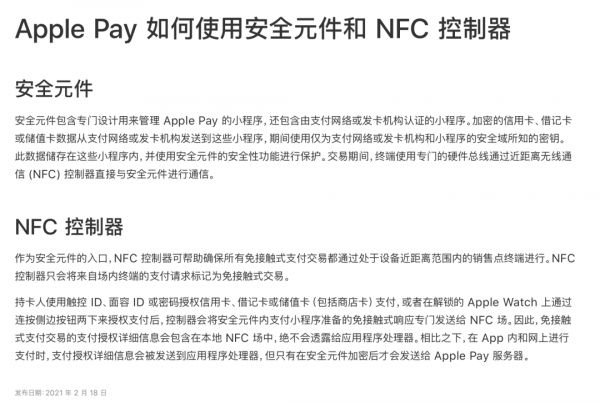 从苹果官方文档可以看出,NFC控制器和安全元件基本上都是服务于Apple Pay的。用一句话概括就是当用户使用Apple Pay支付时,支付信息会被安全元件加密,然后再发送到苹果服务器。