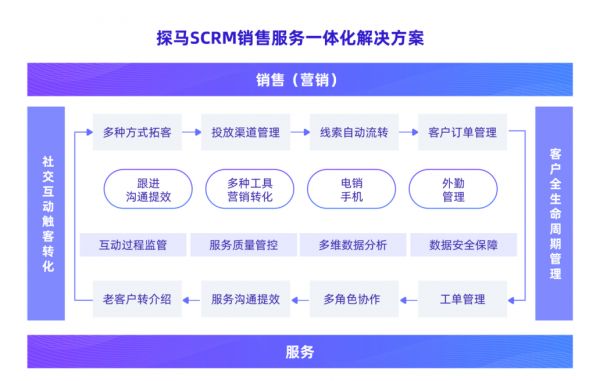 探马SCRM主要从销售场景出发,帮助销售主导型企业更好地管理销售。从覆盖的环节来看,当前探马SCRM从营销获客开始,到客户转化、服务、管理等环节,可提供一体化解决方案。
