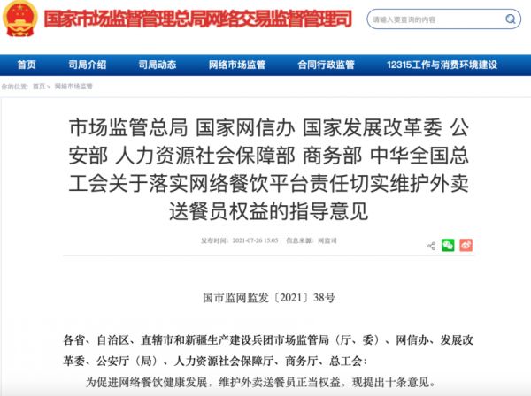7月26日,市场监管总局、国家网信办、国家发展改革委、公安部、人力资源社会保障部、商务部、中华全国总工会联合印发《关于落实网络餐饮平台责任切实维护外卖送餐员权益的指导意见》(以下简称“《意见》”),对保障外卖送餐员正当权益提出全方位要求。