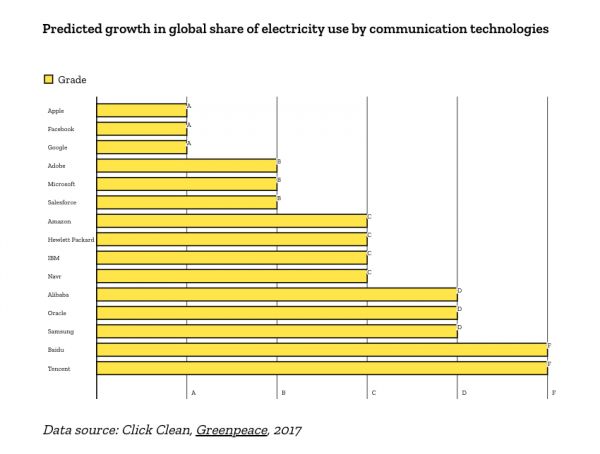 ▲ 对科技企业的可持续评分:苹果、Google和Facebook为A等级,而百度和腾讯被评为F等级,中国的科技巨头似乎还没有大举加入环保赛道。图自环保组织Greenpeace