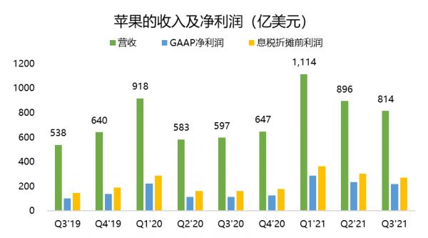 苹果21财年Q3总营收814亿美元,同比增长36%,高于华尔街一致预期的793亿美元,创同期营收新高。