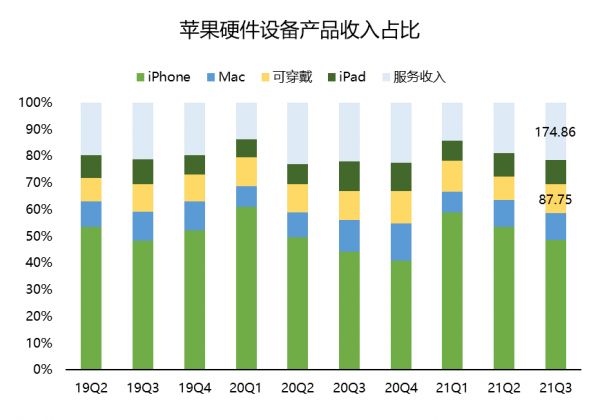分产品来看,当季iPhone营收395.7亿美元,同比激增近50%,高于市场预期的345亿美元;Mac销售收入82.4亿美元,高于预期的79.9亿美元;iPad销售收入73.7亿美元,高于预期的71.3亿美元;可穿戴和家庭设备收入88亿美元,高于预期的76.3亿美元;服务收入174.8亿美元,高于预期的163.2亿美元。产品收入增长的其中一个受限因素是芯片产量,芯片的供应短缺造成的收入损失位于官方预测区间30亿至40亿美元的下限。