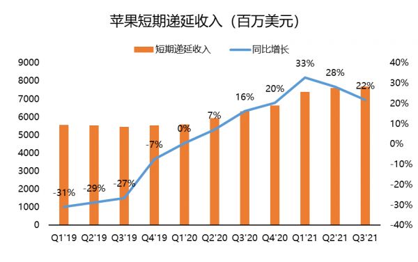 但从另一个指标——递延服务收入,可以看到苹果的短期递延收入(一般为1年以内确认收入的金额)的增速已经开始下降了。短期递延收入大部分是由保险业务的AppleCare和游戏业务的Arcade贡献的。
