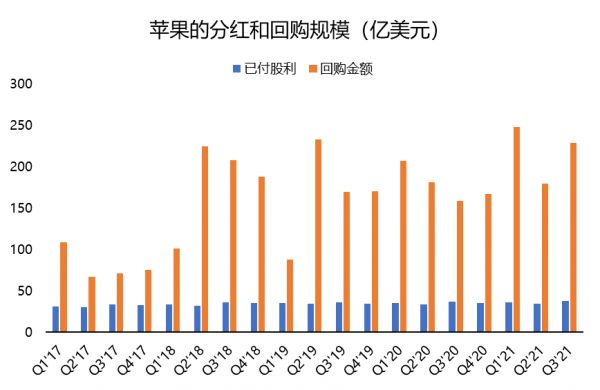 苹果本季度在回购上花费了220亿美元在股票回购上,比上季度增加了27%,其中包括一项5月份启动的50亿美元的加速回购计划,注销了3200万股股份。