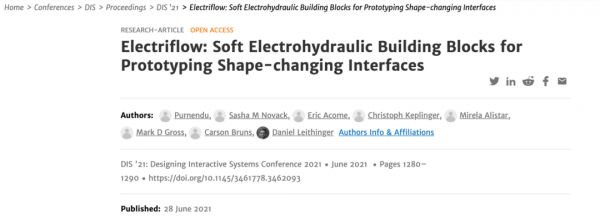 日前,该团队在计算机协会 ACM 2021 年设计交互系统(DIS)会议上展示了这一成果,相关研究论文也以 “Electriflow: Soft Electrohydraulic Building Blocks for Prototyping Shape-changing Interfaces” 为题发表在 The ACM Digital Library 上。