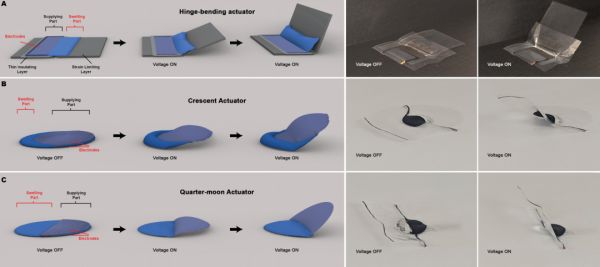 月牙形致动器和弦月形致动器工作原理类似,不过与铰链形不同,这两种致动器产生的不是突变的折痕状变化,而是平滑的曲线状移动,以应用于其他需要弧形运动的情况。其中,月牙形致动器可产生的最大弯曲角约为 60°,而弦月形致动器可产生约 40° 的弯曲,由此满足于不同的弯曲和移动需求。