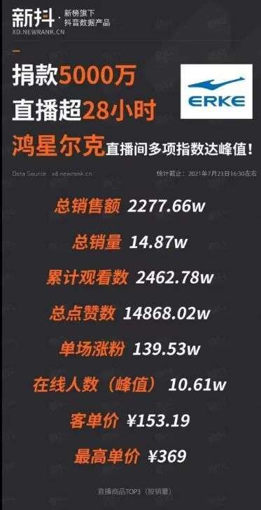 而在7月23日这天,鸿星尔克创造多项直播奇迹:总销售额超2200万,累积观看数超2400万,累计在线人数超10万。
