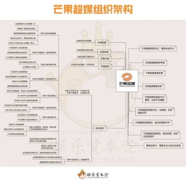 组成芒果超媒的五家公司分别是天娱传媒、芒果影视、芒果娱乐、芒果互娱和快乐阳光。申亚东任天娱传媒总经理,唐藩任芒果影视总经理,何忱任芒果娱乐总经理,郑华平任芒果互娱董事长、总经理,蔡怀军任快乐阳光党委书记、总裁。