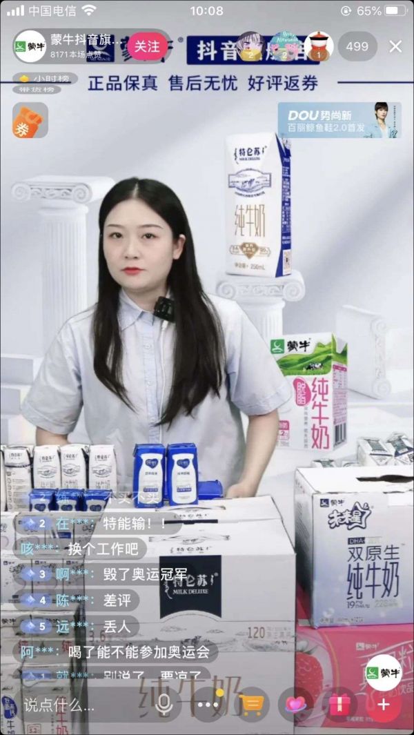 昨晚,因为宁泽涛事件而被冲上热搜的蒙牛迅速关闭了自家的官微评论,本以为随着热搜退了就能就此停息,却不曾想,“沦陷”的还有抖音直播间。