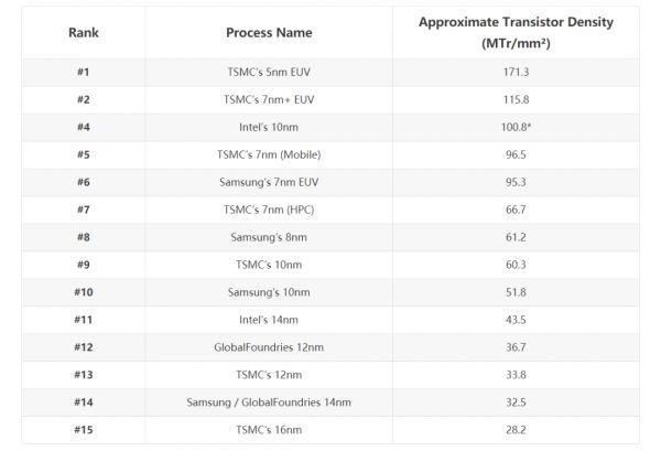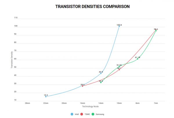 为了更好的对比不同厂商间的芯片制程工艺,我们可以抛开表面的芯片命名方式,用芯片晶体管密度数据来一探究竟。