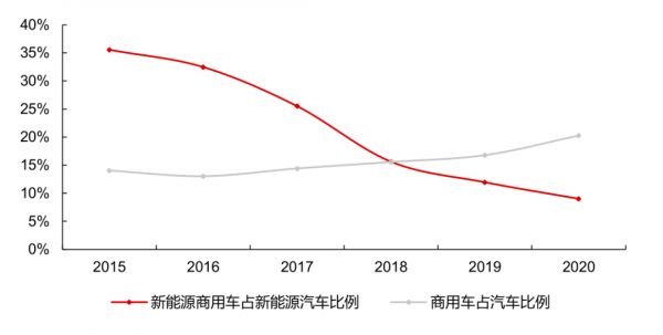 毋庸置疑,国内汽车的电动化成效显著,销量屡创新高,但是电动车的增长主要来自乘用车,商用车几乎没有增长,尤其是中长途的重卡领域,电动化进展缓慢,甚至受阻。过去几年,新能源商用车在新能源内部渗透率不升反降,到了2020年新能源商用车的占比仅有9%。